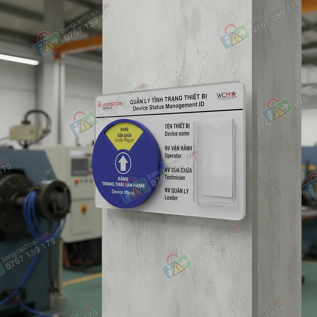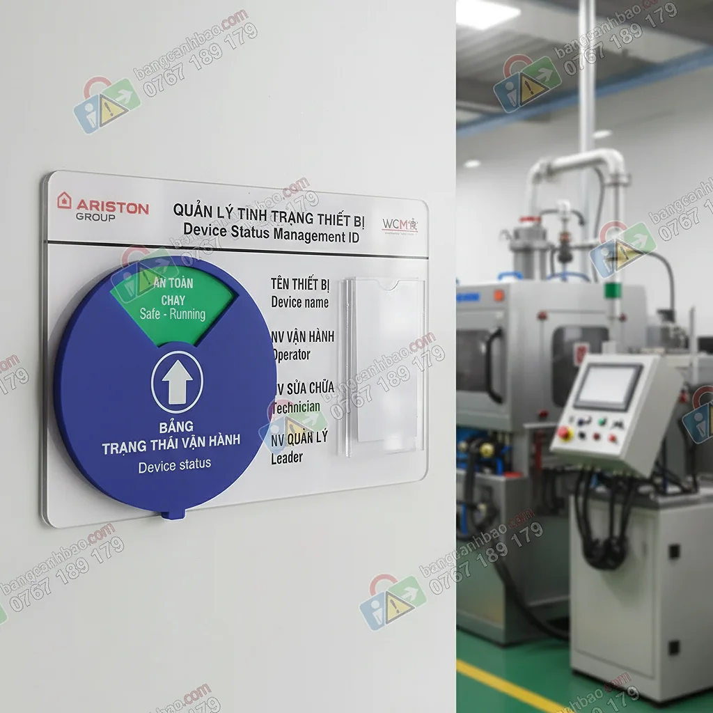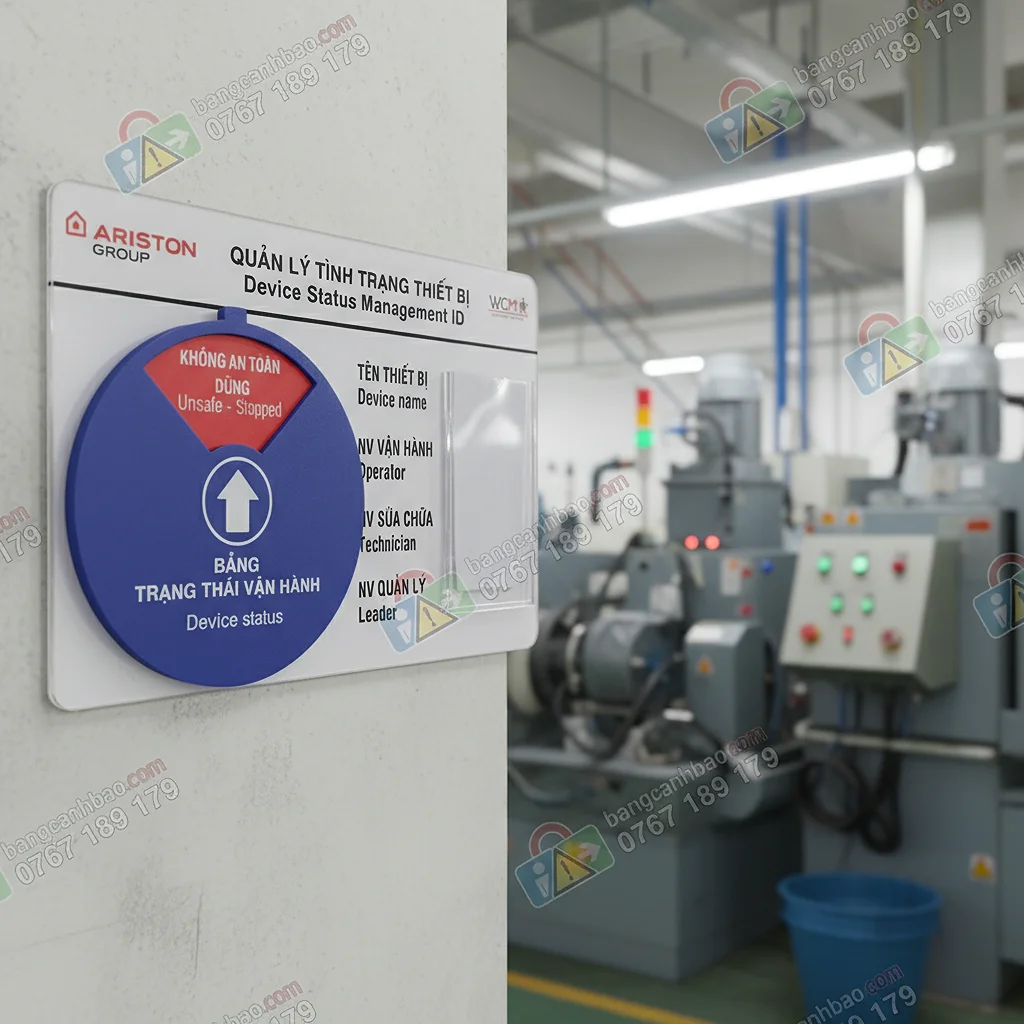 Bảng quản lý tình trạng thiết bị 4 mặt song ngữ Việt – Anh là giải pháp quản lý trực quan giúp nhận diện nhanh trạng thái vận hành của máy móc, thiết bị trong nhà máy, xưởng sản xuất, khu công nghiệp. Sản phẩm được thiết kế khoa học, dễ quan sát, phù hợp với môi trường làm việc có nhiều công nhân và chuyên gia nước ngoài.